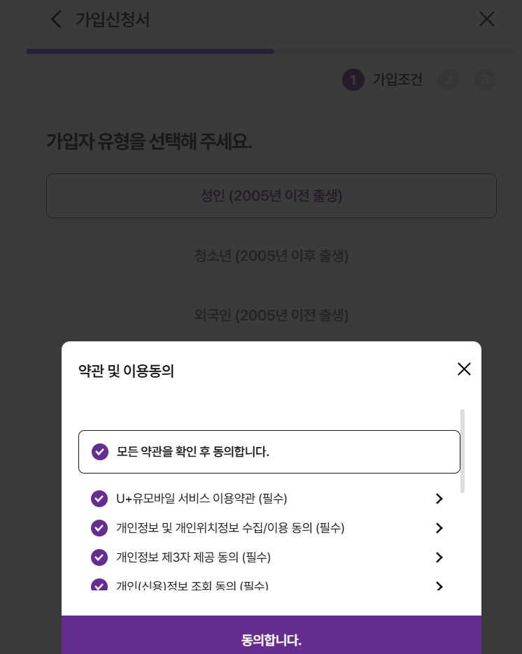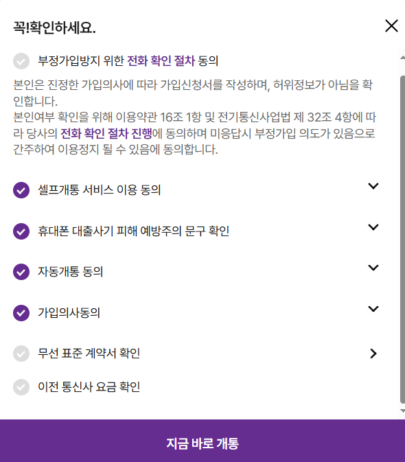 ⑭셀프개통을 위해 각종 동의 후 지금 바로 개통 클릭
