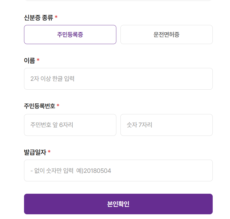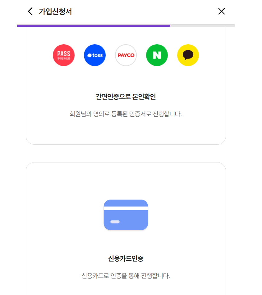 ⑧ 휴대폰, 간편인증, 카드 인증 중 선택 -> 본인인증 진행