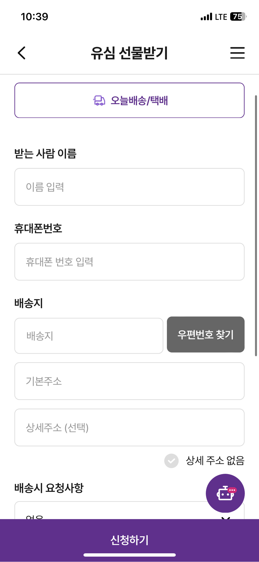 2. [유심선물받기] 버튼 누르셔서 정보를 입력한뒤 신청을 누르면